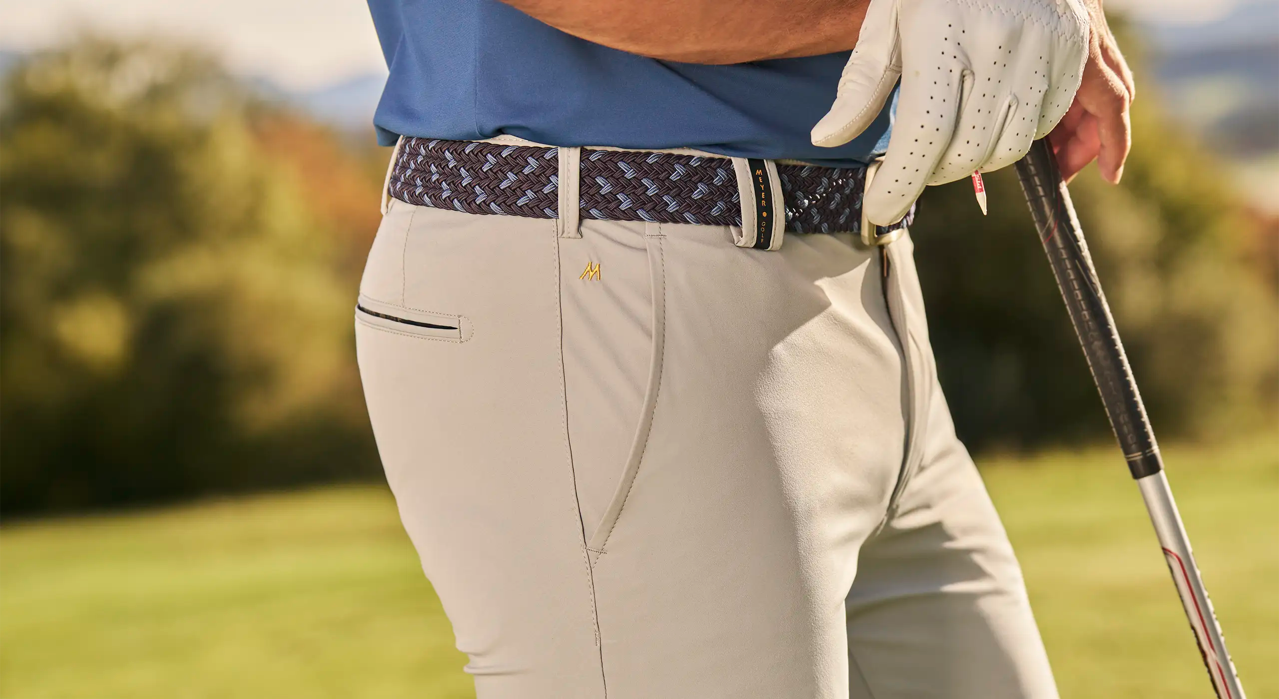 Our outstanding golf trousers come in modern fits and elegant colours. Semi-sartorial details reflect the exclusive character of these chinos. The silicone coating on the inside of the seat pocket holds your glove in place and the shirt grip in the waistband prevents your top from riding up. The high-quality interior with colourful woven pocket lining demonstrates the care with which our golf trousers are made.